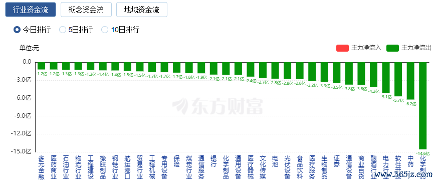 净流出方面,化学制药、中药等排名靠前,其中化学制药净流出14.6亿元。