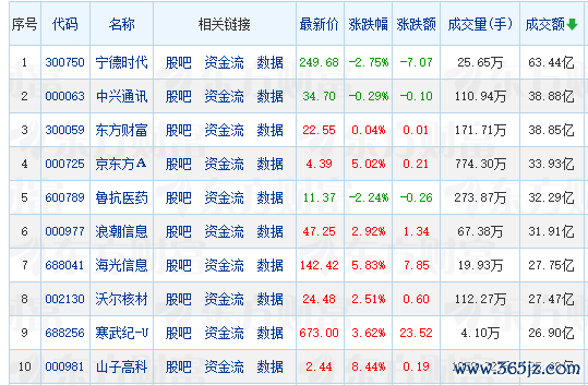个股成交金额方面,截至午间收盘,宁德时代位列第一,成交金额63.44亿元;中兴通讯位列第二,成交金额38.88亿元。