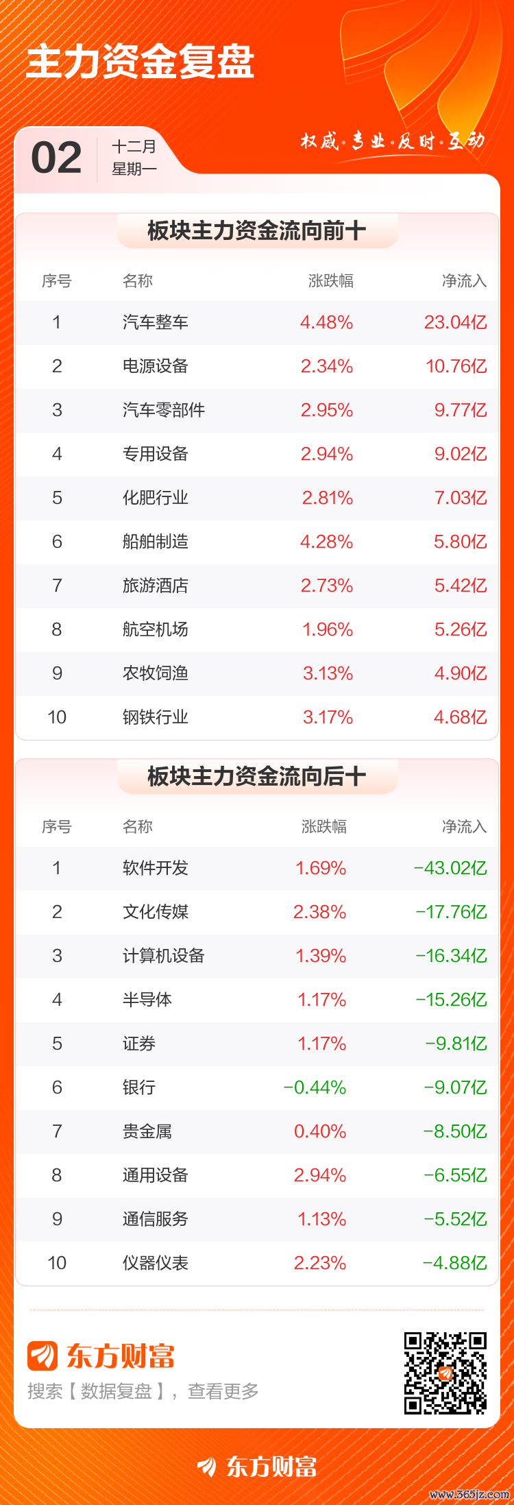 12月2日,沪指涨1.13%,深成指涨1.36%,创业板指涨1.42%。两市成交额1.79万亿,较上个交易日放量784亿。数据显示,今日大盘主力资金净流出54.38亿。汽车整车、电源设备、汽车零部件等板块主力资金流入排名居前,杠杆炒股平台其中汽车整车净流入23.04亿元。